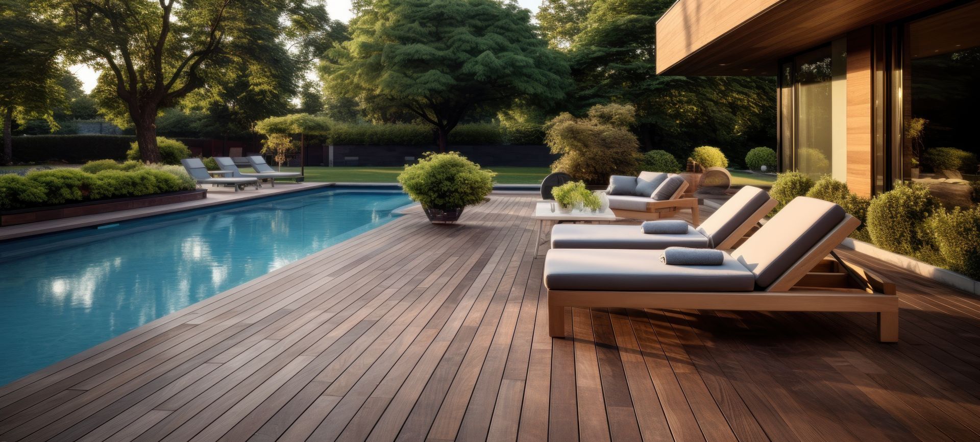 Création de terrasses, allées pavées, plages de piscine en pierre, bois exotique...